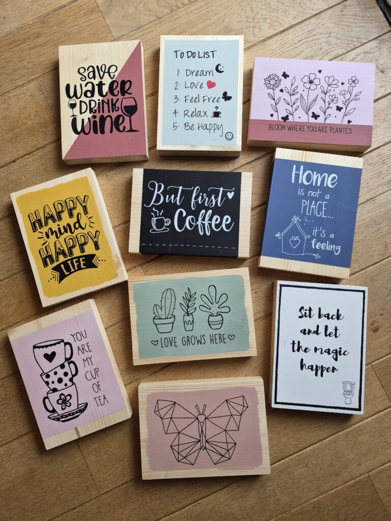 CreaLou neemt heel veel voorbeeld teksten en afbeeldingen mee waaruit je kunt kiezen, maar het is ook mogelijk je eigen tekst mee te nemen. Houd er dan rekening mee dat het plankje 15×20 cm is. De tekst of afbeeldingen moet duidelijke lijnen hebben en niet te klein zijn.